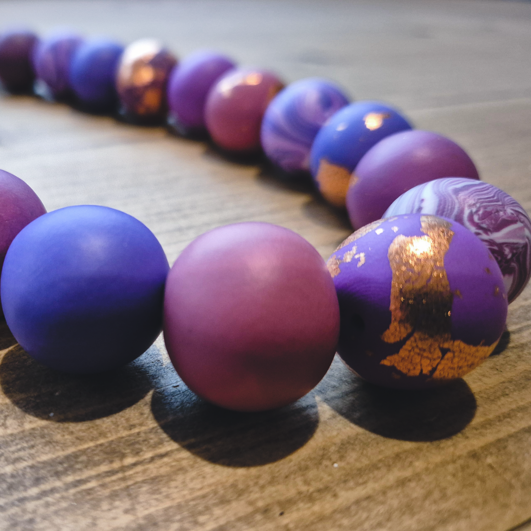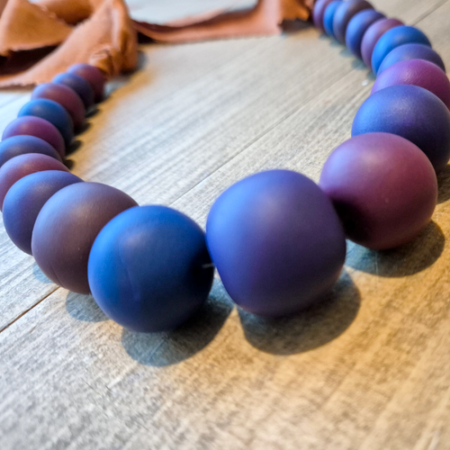 Seagreen & Blue necklaces are made from polymer clay. Colours are mixed by hand in small batches before each individual bead is weighed, rolled, baked, pierced & strung.